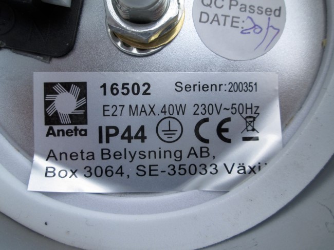 MAX. 40W-E27, 230V, 50Hz, class I, IP44 |