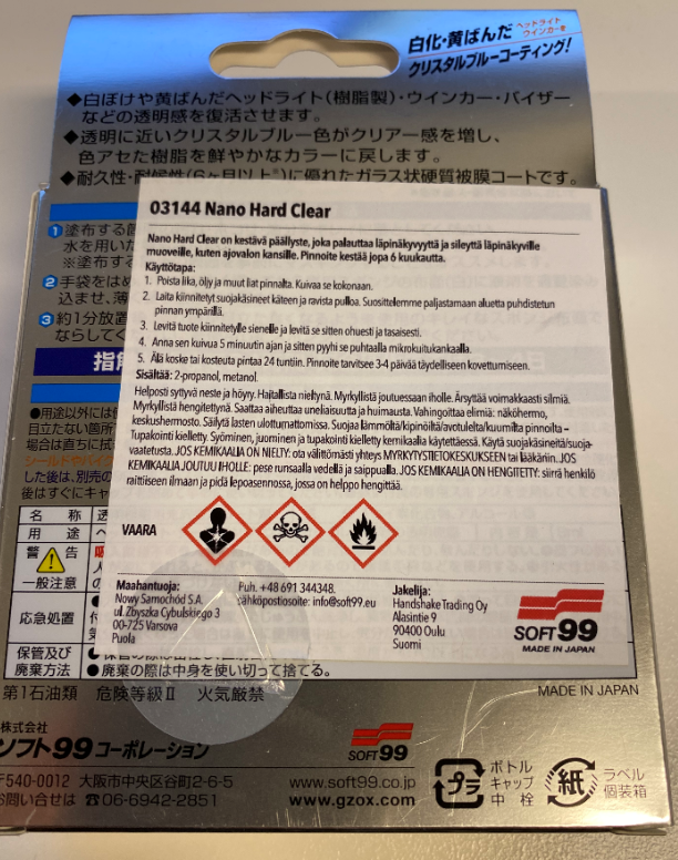 Soft99 Nano Hard Plastics Coat Clear kemikaalin, joka sisältää metanolia ja on luokiteltu välittömästi ja elinkohtaisesti myrkylliseksi, yleiseen kulutukseen myydyissä ulko- ja sisäpakkauksissa ei ole lainsäädännön vaatimuksien mukaisia varoitusetikettejä eikä kemikaalia sisältävässä pullossa ole standardin mukaista turvasuljinta.