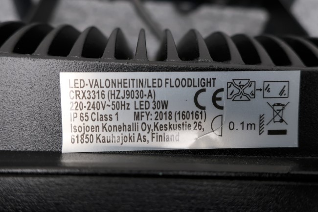 Tuote ei täytä sähköturvallisuuslain (1135/2016) eikä tuotetta koskevan eurooppalaisen harmonisoidun standardin EN 60598 vaatimuksia. Tuotteen liitäntäjohto taivutuskoetta alhaisessa lämpötilassa (-35°C).