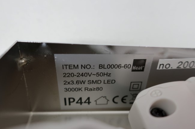 2x3.6W SMD LED, 220-240V, 50Hz,class II, IP44, 3000K, Ra>= 80. |