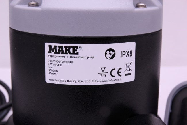Tuote ei täytä sähköturvallisuuslain (1135/2016) eikä tuotetta koskevan eurooppalaisen harmonisoidun standardin EN 60335 vaatimuksia.Tuote ei täytä kotelointiluokan IPX8 (pysyvä upotus) vaatimuksia.