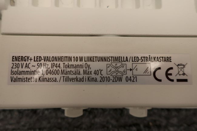 Tuote ei täytä sähköturvallisuuslain (1135/2016) eikä tuotetta koskevan eurooppalaisen harmonisoidun standardin EN 60598 vaatimuksia. Tuote ei täytä kotelointiluokan IPX4 (roiskevesikoe) vaatimuksia.