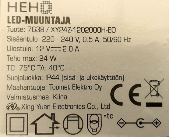 DS-24W, 12VDC, class III, IP44. Liitäntälaite: 220-240V;50/60Hz;0,5A;12VDC/2,0A/24W;SELV;class II;IP44;TC:75°C;TA:40°C |