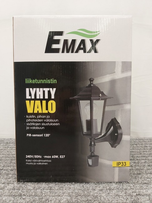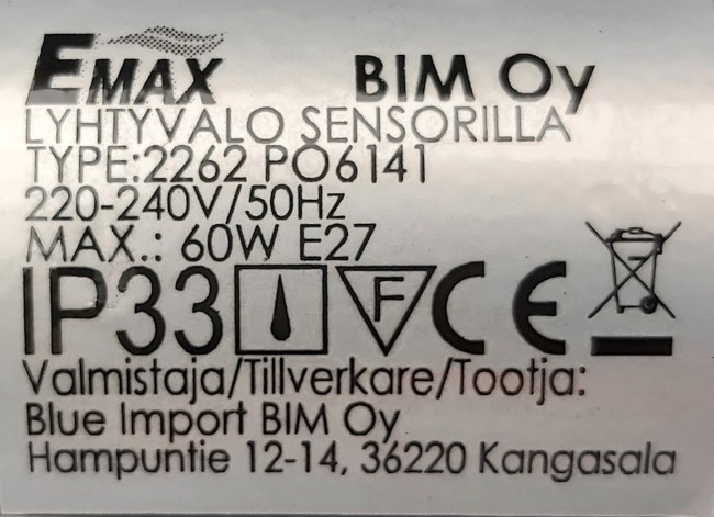 Max. 60W-E27, 220-240V, 50Hz, class I, IP33, PIR |