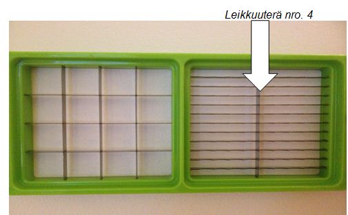 Genius Nicer Dicer Plus tuotteissa, jotka on toimitettu 28.10. - 31.11.2013 välisenä aikana TVNS Skandinavia AB:n verkkokaupan kautta, leikkuuterässä nro 4 on havaittu puute turvallisuudessa. Terä saattaa olla virheellinen, minkä vuoksi terä saattaa aiheuttaa vaaraa. Terän käyttö on lopetettava välittömästi. Yritykseltä saatujen tietojen mukaan vikaa ei ole muina aikoina toimitetuissa tai muiden yritysten kuluttajille toimittamissa tuotteissa. Yritys on asiakasrekisterinsä perusteella ottanut yhteyttä kaikkiin viallisen tuotteen ostaneihin tahoihin.