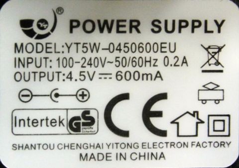 Class II, IPX0, Input : 100-240V~, 50/60Hz, 0.2 A, Output : 4.5VDC, 600mA |
