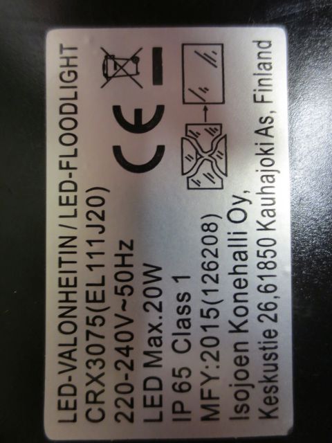 Valaisimessa ei ole suojausluokan III tunnusta ja liitäntälaitteesta puuttuu tc-lämpötilan merkintä. Valaisin ei täytä sähköturvallisuuslain (1135/2016) eikä valaisinta koskevien eurooppalaisten harmonisoitujen standardien EN 60598 ja EN 61347 vaatimuksia.