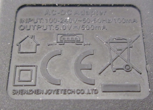 100-240V~, 50~60Hz, 100mA Putput: 5.0V, 500mA |