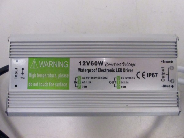 LED-nauha: DS-5W,12V,class III,IP54,length: 5m. Liitäntälaite: 90-250V;50/60Hz;1,2A;12Vdc/5A;Pout 60W;class I;IP67 |