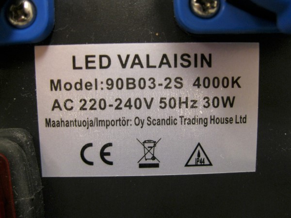 Tuote ei täytä sähköturvallisuuslain (1135/2016) eikä tuotetta koskevan eurooppalaisen harmonisoidun standardin EN 60598 vaatimuksia. Valaisin ei täytä sille ilmoitettua kotelointiluokkaa veden haitallista tunkeutumista vastaan (IPX4 - roiskevedenvedenpitävyys).