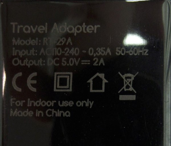 Input: 110-240 VAC; 0,35 A; 50-60 Hz Class II. Output: 5,0 VDC; 2,0 A |