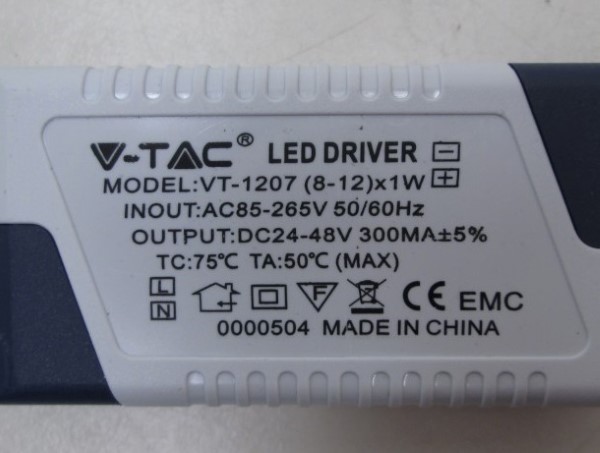Valaisin: DS-12W;300mA(cc);class III:IP20. Liitäntälaite: 5-265V;50/60Hz;24-48Vdc/300mA(cc);class II;IP20;ta 50°C;tc 75° |