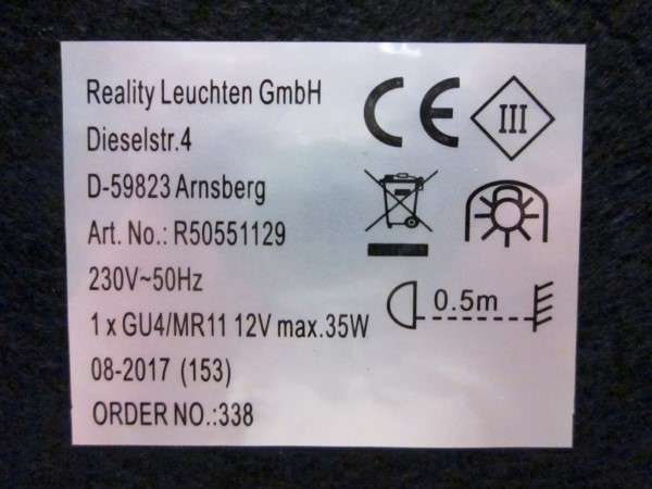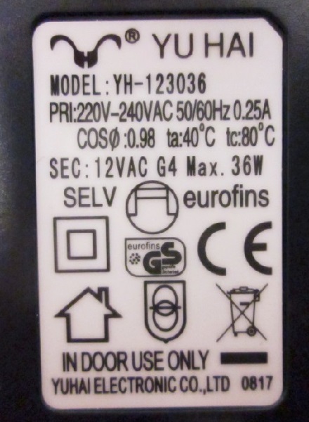 max 35W-1xGU4/MR11, 220-240V/12V, 50/60Hz, class II/III |