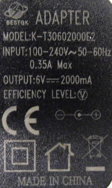 Input: 100-240 VAC, 50-60 Hz, 0,35 A Max; Suojausluokka II / Class II. Output: 6 VDC, 2000 mA |