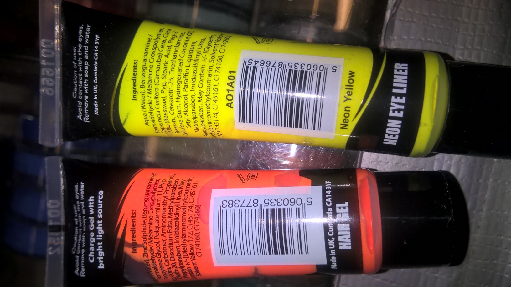 Silmänrajausvalmiste, keltainen, sisältää väriaineita CI45174, CI 45161 ja Solvent Yellow 172. Kyseessä olevia väriaineita ei ole luetteloitu EU:n kosmetiikka-asetuksen liitteeseen IV. Kosmeettisissa valmisteissa ei saa käyttää muita kuin liitteessä IV lueteltuja väriaineita.