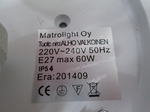 Tuote ei täytä kotelointiluokan IPX4 (roiskevesikoe) vaatimuksia. Tuote ei täytä sähköturvallisuuslain (1135/2016) eikä tuotetta koskevan eurooppalaisen harmonisoidun standardin EN 60598 vaatimuksia.