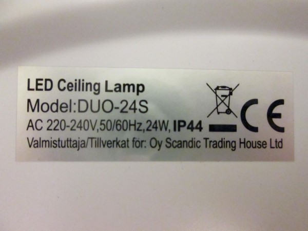 Tuote ei täytä sähköturvallisuuslain (1135/2016) eikä tuotetta koskevan eurooppalaisen harmonisoidun standardin EN 60598 vaatimuksia. Tuote ei täytä kotelointiluokan IPX4 (roiskevesikoe) vaatimuksia.