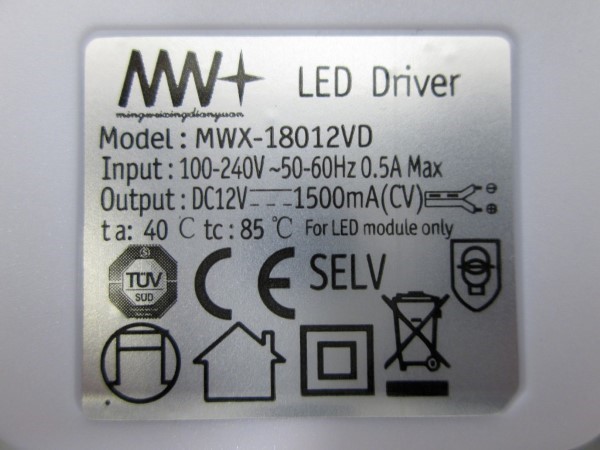 Liitäntälaite : 100-240V, 50-60Hz, 0,5A, 12VDC (CV) / 1500mA, lk II, IP20, tc 85°C, ta 40°C, SELV |