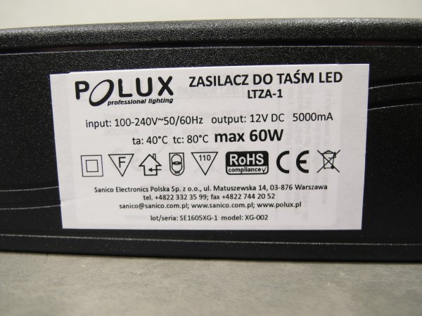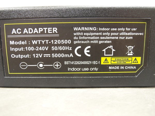 100-240VAC, 50/60Hz Output: 12VDC, 5000mA |