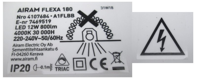 Tukesin päätöksellä valaisin on määrätty poistettavaksi markkinoilta. Päätös koskee valaisinta, jonka valmistuserätunnus on 31W18. Tunnus on merkitty valaisimen arvokilpeen.