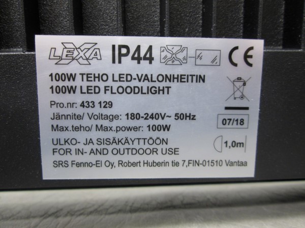 Valonheittimen liitäntäkaapeli (H05RN-F 3G1,0mm² Shangiy Jintao Electron) ei kestä standardien EN 50525-2-21, EN 50363-2-1 ja SFS 6000-8-813 (2017) mukaista taivutuskoetta alhaisessa lämpötilassa (-35°C). Tuote ei täytä sähköturvallisuuslain (1135/2016) eikä tuotetta koskevan eurooppalaisen harmonisoidun standardin EN 60598 vaatimuksia.