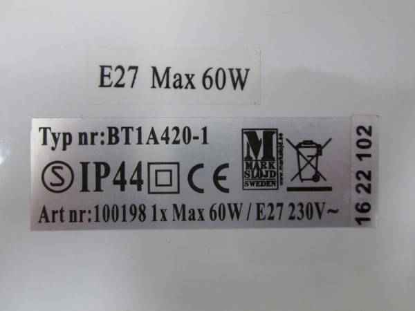 Tuote ei täytä sähköturvallisuuslain (1135/2016) eikä tuotetta koskevan eurooppalaisen harmonisoidun standardin EN 60598 vaatimuksia. Valaisin ei täytä sille ilmoitettua kotelointiluokkaa veden haitallista tunkeutumista vastaan (IPX4 - roiskevedenvedenpitävyys).Valaisimen kupu ei kestä standardin mukaista iskuvasarakoetta. Iskuvasarakokeen jälkeen tuote ei täytä kotelointiluokan IP44 vaatimuksia.