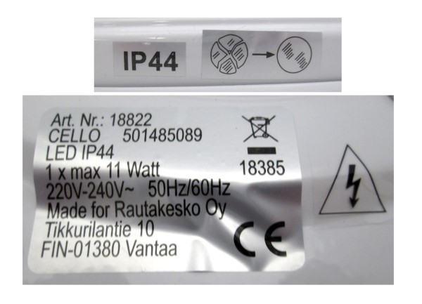 Tuote ei täytä kotelointiluokan IPX4 (roiskevesikoe) vaatimuksia. Tuote ei täytä sähköturvallisuuslain (1135/2016) eikä tuotetta koskevan eurooppalaisen harmonisoidun standardin EN 60598 vaatimuksia.