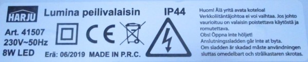 Tuote ei täytä kotelointiluokan IPX4 (roiskevesikoe) vaatimuksia. Tuote ei täytä sähköturvallisuuslain (1135/2016) eikä tuotetta koskevan eurooppalaisen harmonisoidun standardin EN 60598 vaatimuksia.