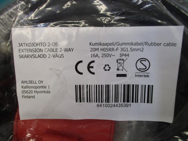 16 A, 250 V ~, IP44, 2P+suojakosketin, kaapeli H05RR-F 3G1,5 mm², pituus 20 m, kahdelle schukopistotulpalle |