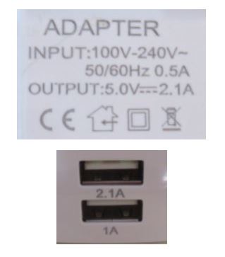100-240VAC, 50/60Hz 0.5A Output: 5.0VDC, 2.1A |