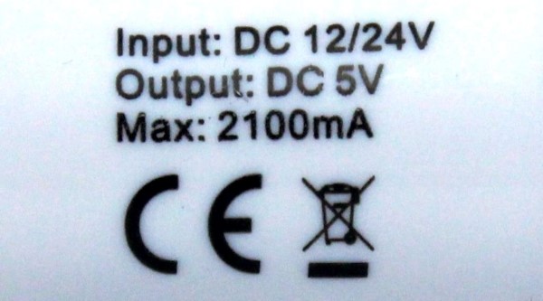 Input: DC 12/24V, Class III, IPX0. Output: DC 5V, max:2100mA |