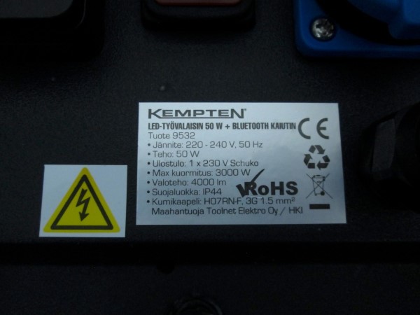 Tuote ei täytä kotelointiluokan IPX4 (roiskevesikoe) vaatimuksia.Tuote ei täytä sähköturvallisuuslain (1135/2016) eikä tuotetta koskevan eurooppalaisen harmonisoidun standardin EN 60598 vaatimuksia.