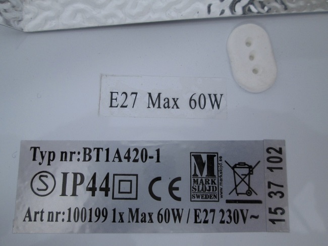 Tuote ei täytä sähköturvallisuuslain (1135/2016) eikä tuotetta koskevan eurooppalaisen harmonisoidun standardin EN 60598 vaatimuksia.Tuote ei täytä kotelointiluokan IPX4 (roiskevesikoe) vaatimuksia. Lisäksi valaisimen kupu ei kestä iskukoetta.