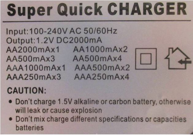 100-240VAC, 50/60Hz Output: 1.2VDC, 2000mA |
