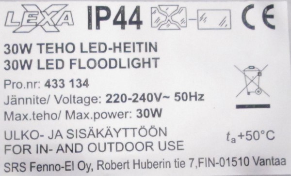 30W, 220-240V, 50Hz, IP44, class I |