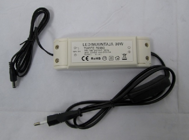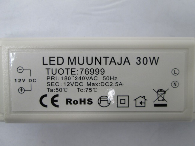 180-240VAC, 50Hz Output: 12VDC, 2.5A, Class II, IP20, Ta:50°C, Tc:75°C |
