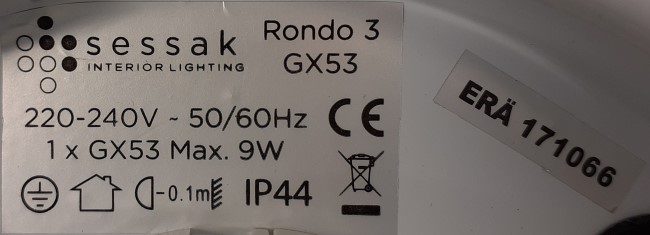9W-GX53, 220-240V, 50/60Hz, class I, IP44 |