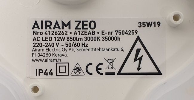 Tuote ei täytä kotelointiluokan IPX4 (roiskevesikoe) vaatimuksia. Tuote ei täytä sähköturvallisuuslain (1135/2016) eikä tuotetta koskevan eurooppalaisen harmonisoidun standardin EN 60598 vaatimuksia.