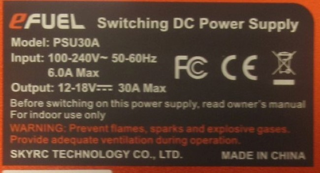 Input: 100-240VAC 50/60Hz 6.0A max. Class I. Output: 12-18VDC 30A max. |