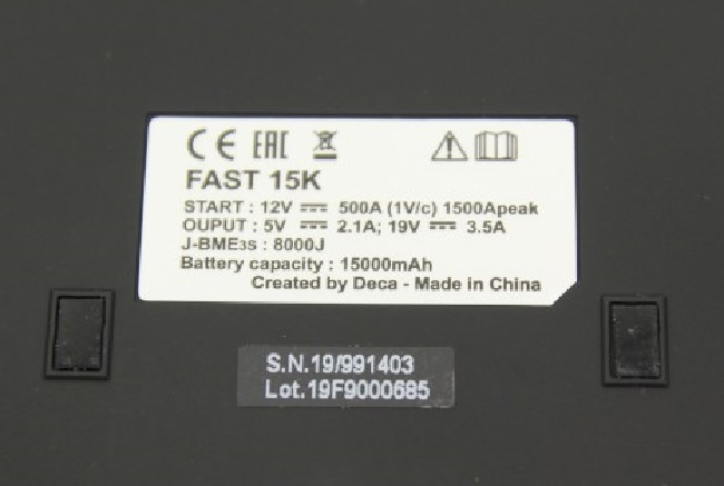 Apukäynnistin:Start:12VDC,500A,1500Apeak.Output:5VDC;2,1A;19VDC;3,5A.J-BME3s:8000J.15000mAh |