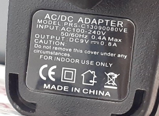 Latauslaite: Input: 100-240VAC, 50/60Hz, 0,4A. Output: 9VDC 0,8A |