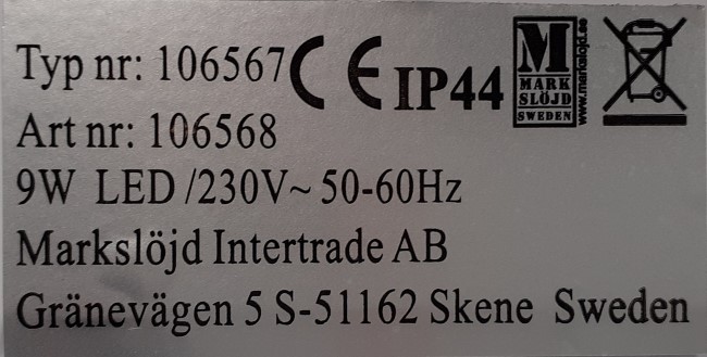 Valaisin:DS-9W;230V;50-60Hz;class I;IP44.Liitäntälaite:220-240V;50-60Hz;92mA;0,35A(CC)/31VDC/6-9x1W;U-OUT max.36VDC;SELV |