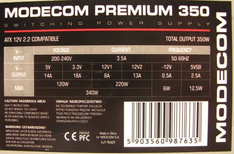 200-240VAC,3,5A,50-60Hz,3,3V/18A,5V/14A,12V1/8A,12V2/13A,-12V/0,5A,5Vsb/2,5A,350W |