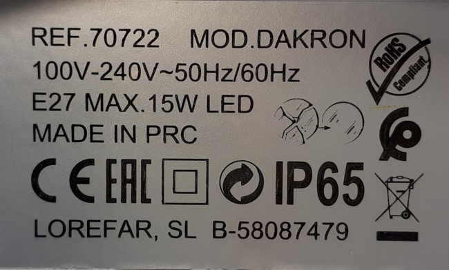 max. 15W-E27-LED, 100-240V, 50/60Hz, class II, IP65 |