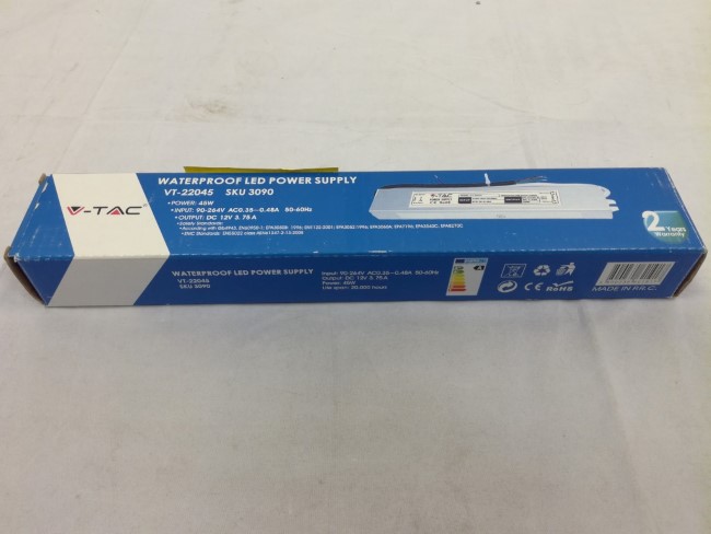 90-264V, 50-60Hz, 0,35-0,48A, 12VDC / 3,75A / 45W, class I, IP65, SELV |