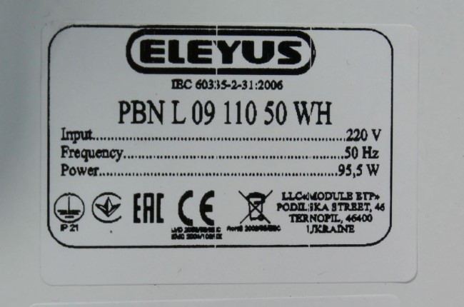 220V, 95,5W, 50Hz, Class II |