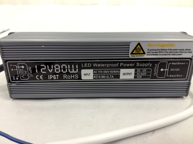 170-250V, 50/60Hz, 0,96~0,7A, 12VDC / 6,67A / 80W, class I, IP67 |