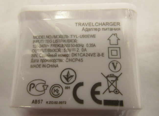 Input : 100 – 240 VAC, 50/60 Hz, 0,35 A. class II. Output: 5,0 VDC, 2,0 A |