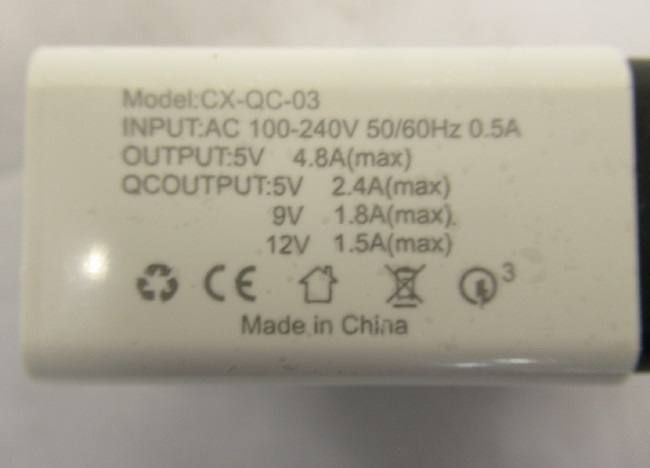 Input: 100 – 240 VAC, 50/60 Hz 0,5 A; Class II. Output: 5 VDC, 4,8 A QC: 5 VDC, 2,4 A, 9 VDC, 1,8A, 12 VDC 1,5A |
